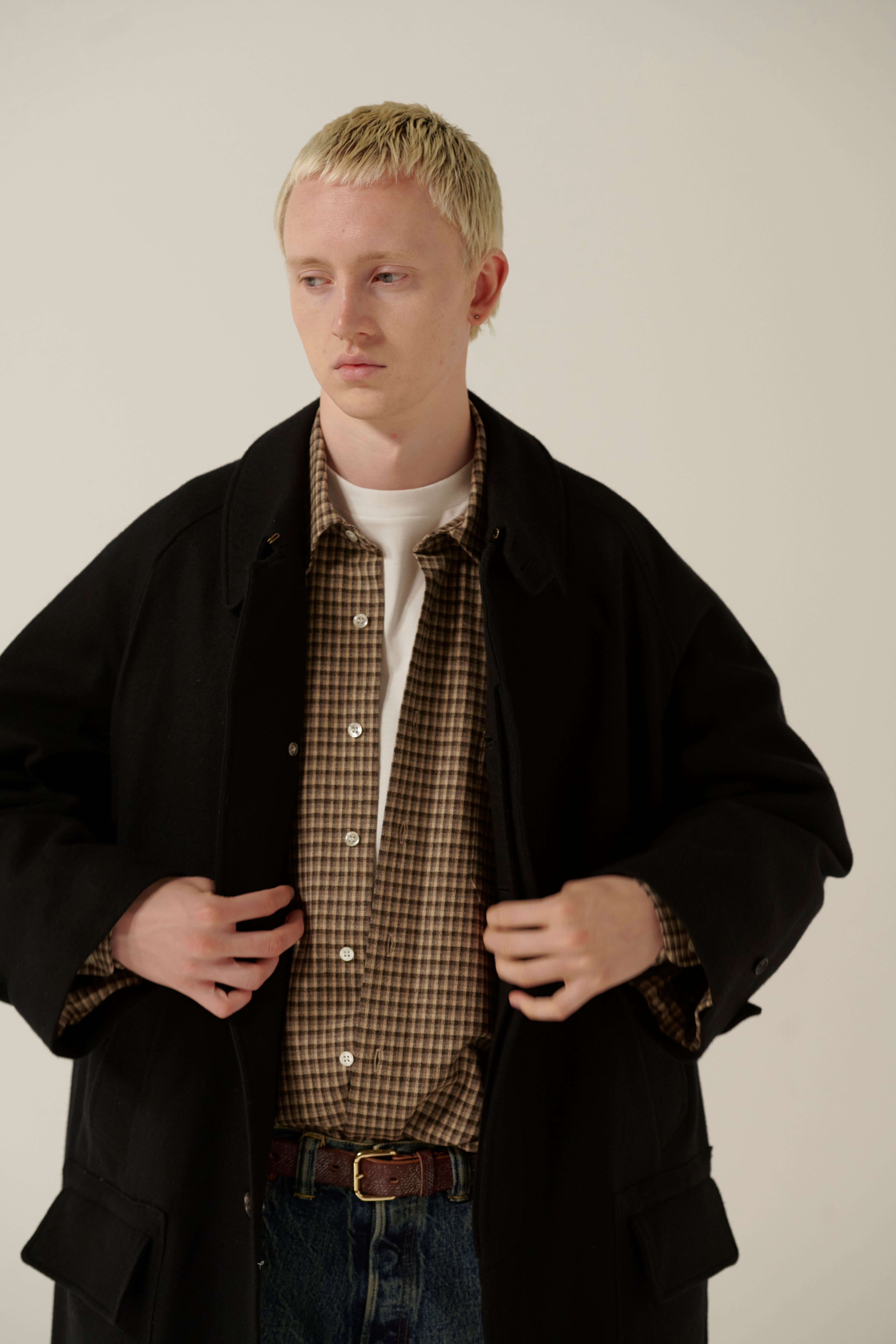 仏LVMHのデッドストックコレクションからピックした、ヴァージンウール主体のギンガムチェックスーチング⽣地。ブラウン〜ベージュ系の⾊合いと細かな⽑⾜感であたたかな雰囲気を表現しています。ヴァージンウールにヴィスコース等を合わせることで、上品な光沢感とほどよいハリ感を両⽴させています。