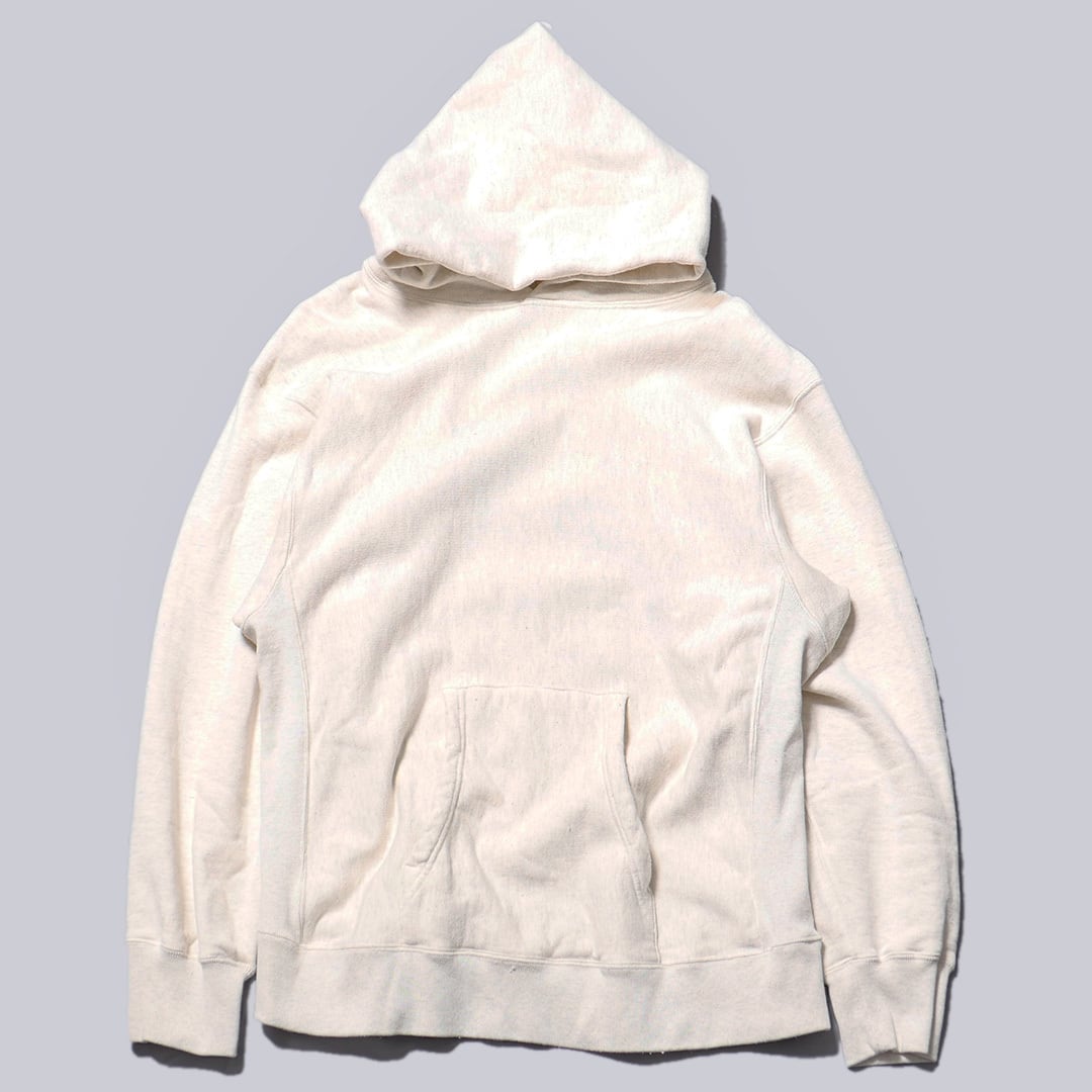 チャンピオンのリバースウィーブの中でも、たっぷりとしたシルエットと袖回りが特徴的な1980年代の個体をベースに作成したパーカー。⾝頃の⽣地は横使い、肩ハギなし、サイドに配したリブなどリバースウィーブらしいデザインを踏襲しています。裾や袖のリブもヴィンテージにならいしっかりとした⼱を持たせた他、フードやポケットも当時の個体からトレー スした⼤振りのサイズ感です。 当時のリバースウィーブにならい、⼆本針をベースに縫製しています。