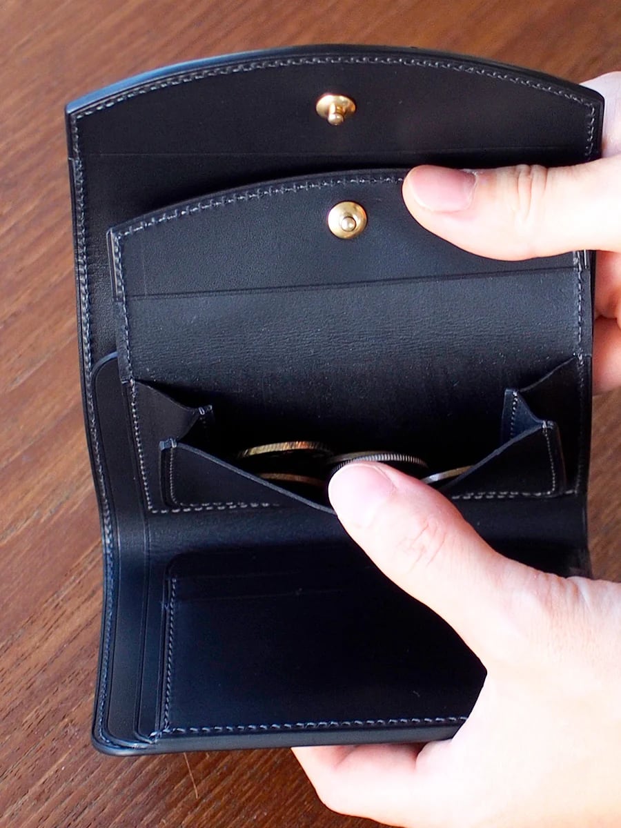 収まりのいいコンパクトな大きさながら2枚の札入れ・十分なカードの収納力・コインポケットを備えた構造です。