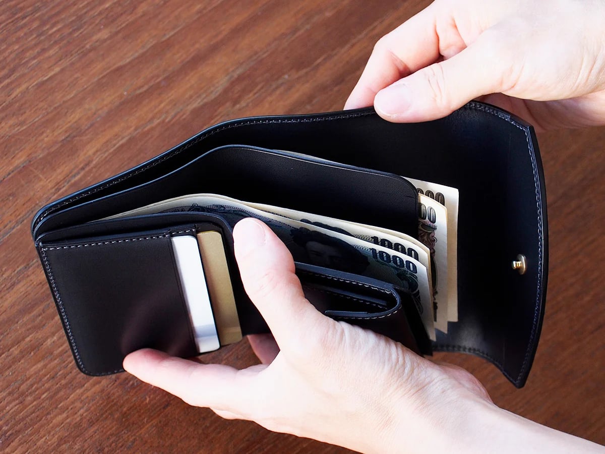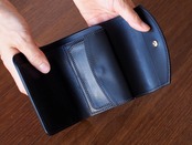 収納力のあるフラップタイプの三つ折り財布。