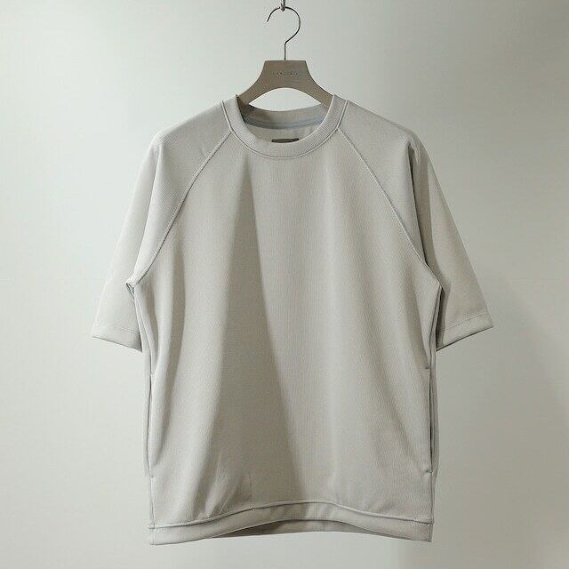 リサイクルポリエステルで編み立てたダブルフェイス素材を用いたクルーネックTシャツ。回収した原料をケミカルリサイクルによって一度引き揃えの三子糸にした後に仮撚りという工程を経て、表面の風合いに変化を出しています。ラグランスリーブの袖丈を少し長めに設定し、身幅にも適度なゆとりを持たせたリラックスシルエット。裾のドローコードを絞って丸みを出すこともできます。厚すぎず薄過ぎずの生地なので長いシーズン着用可能。シームポケット有り。